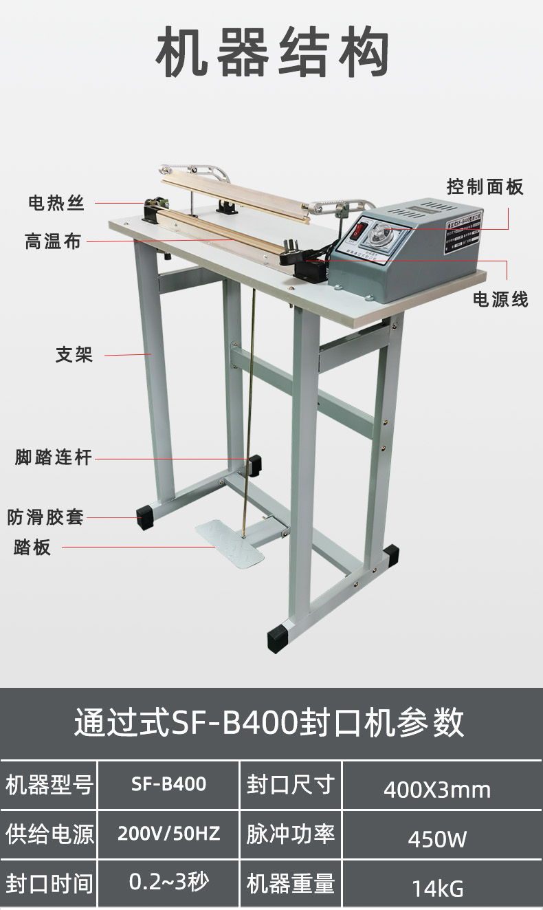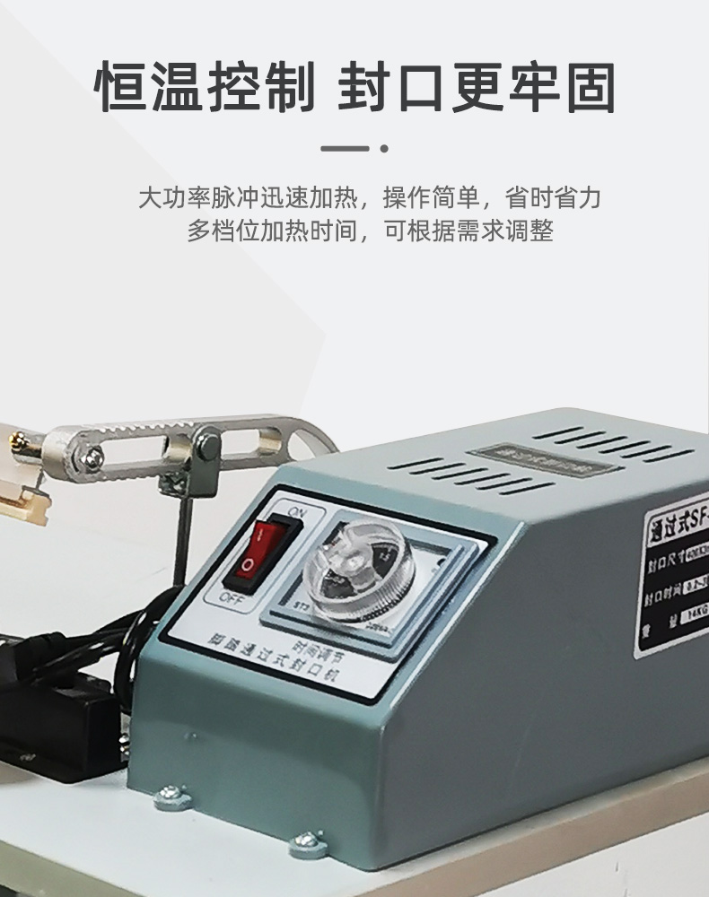 - 高速度生產(chǎn):如果生產(chǎn)線上要求通過(guò)式封口機(jī)每分鐘封口數(shù)量較多,如達(dá)到 50 - 100 袋甚至更多,為了在短時(shí)間內(nèi)完成封口操作,就需要選擇功率較大的設(shè)備,一般在 1000W 以上,以保證快速加熱和冷卻,滿足生產(chǎn)節(jié)奏。