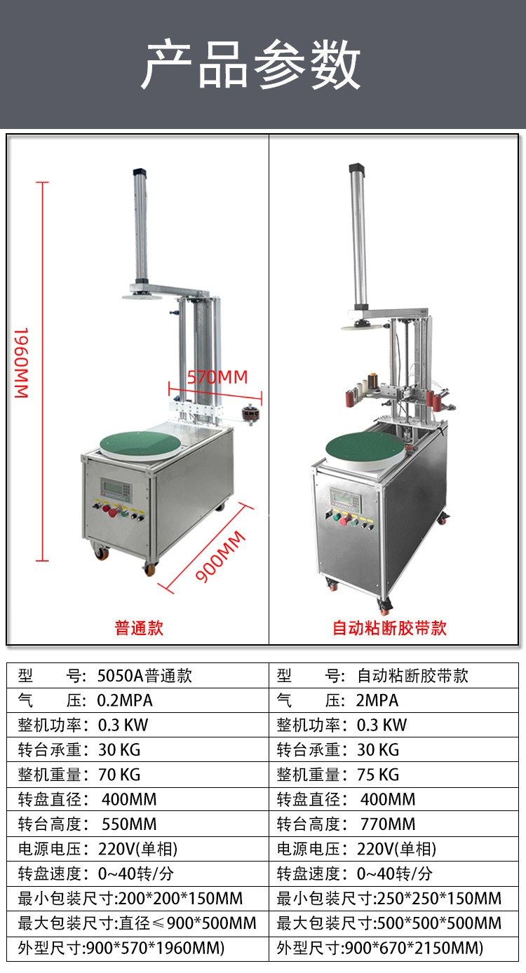 - 貨物纏繞機(jī):主要用于托盤貨物、大型設(shè)備等的包裝,通過旋轉(zhuǎn)工作臺(tái)帶動(dòng)貨物旋轉(zhuǎn),同時(shí)膠帶從上方或側(cè)面進(jìn)行纏繞,如常見的物流倉(cāng)儲(chǔ)用膠帶纏繞機(jī)。
