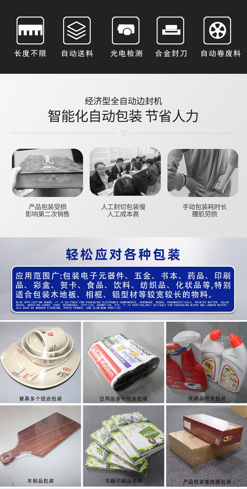 - 包裝長度無限制邊封機(jī)采用對(duì)折薄膜裹包產(chǎn)品的方式,形成環(huán)繞產(chǎn)品的薄膜 “套管”,僅對(duì)產(chǎn)品的側(cè)邊和尾部進(jìn)行封切。其中尾部封切是隨著產(chǎn)品連續(xù)輸送,由橫封刀實(shí)時(shí)下落完成相鄰產(chǎn)品的分隔封口,無需受設(shè)備框架尺寸制約。再加上水平和垂直兩組光電傳感器自動(dòng)偵測產(chǎn)品長度,不管是短至幾厘米的小物件,還是長至數(shù)米的鋁型材、木地板等,都能順暢完成包裝,不用更換適配不同長度的部件。