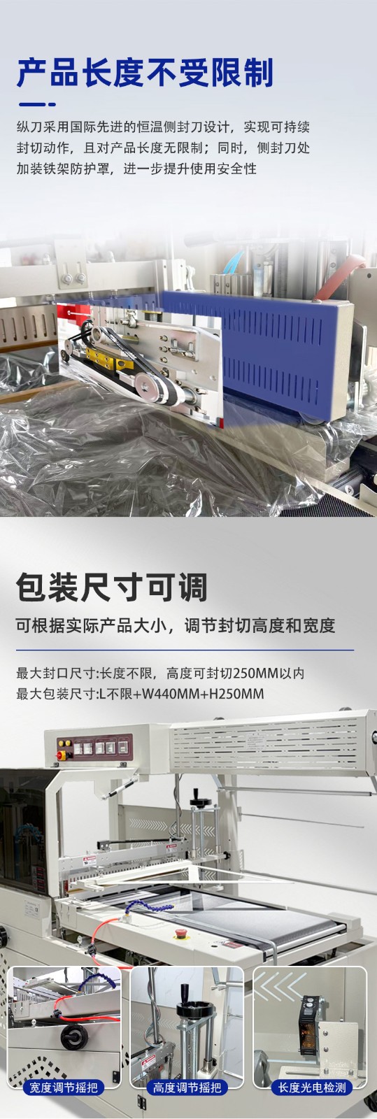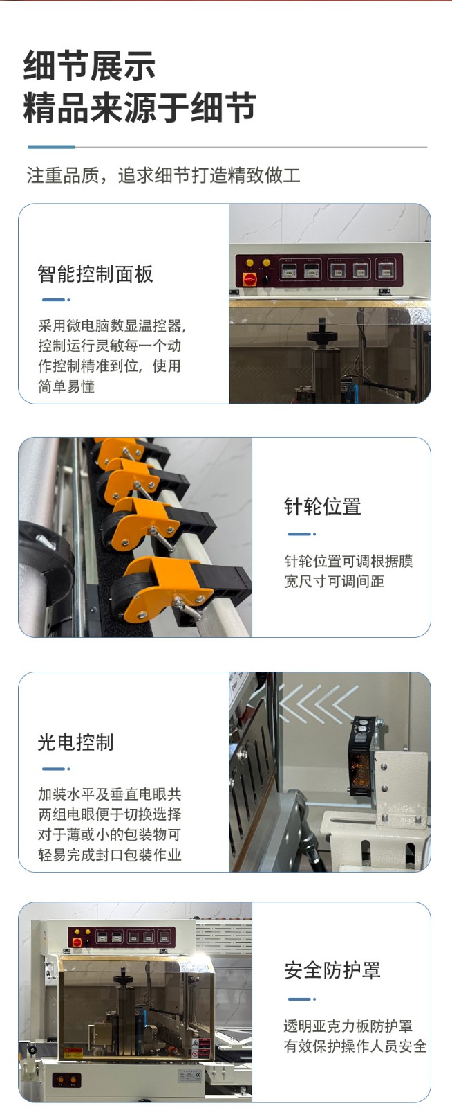 - 兼容多種包裝薄膜:其恒溫加熱封切系統(tǒng)可適配 PE、PVC、POF 等多種常用熱收縮膜。而且封刀多采用美國杜邦特弗龍防粘涂層,能應(yīng)對(duì)不同薄膜的封切溫度需求,避免薄膜粘連刀具,保證封口牢固不焦化,像 POF 這種對(duì)封切精度要求高的環(huán)保薄膜,也能實(shí)現(xiàn)理想封切效果。