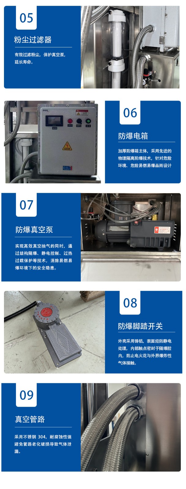 - 密封與過濾部件:機(jī)頭柜和電柜均采用全密封設(shè)計(jì)并加裝密封膠條,防止易燃易爆氣體、粉塵進(jìn)入內(nèi)部損壞元件或引發(fā)短路;關(guān)鍵的抽氣口、真空室等采用 304 不銹鋼材質(zhì),部分機(jī)型還配有 40mm 厚的有機(jī)玻璃透明觀察窗,既保障防爆性能又便于觀察包裝過程;同時(shí)加裝粉末隔離和過濾裝置,防止包裝物料中的粉塵堵塞真空泵,避免設(shè)備故障導(dǎo)致的安全問題。