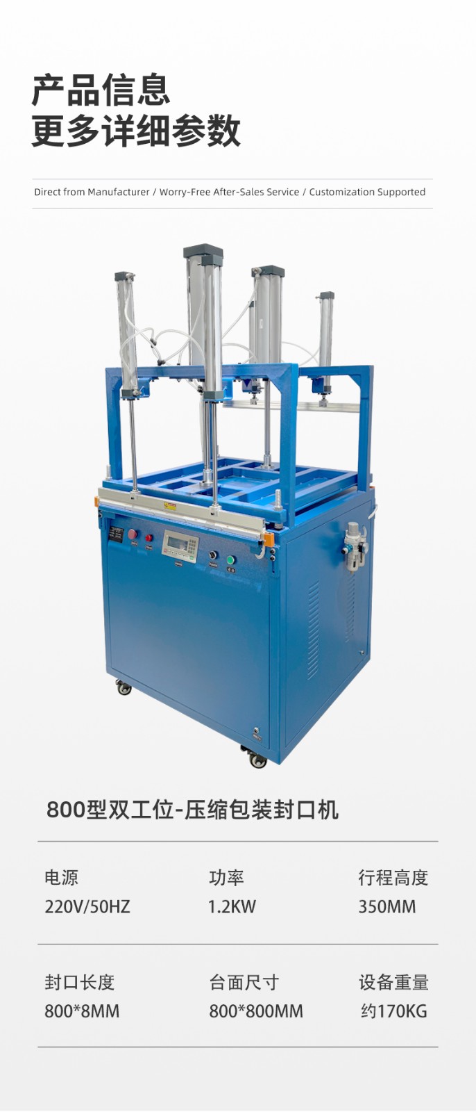 雙工位壓縮封口機:兩個工位可同時作業(yè),一邊封口時另一個可放件 / 取件,適合中小批量、多規(guī)格產(chǎn)品(如多口味食品、電子元件袋),效率比單工位高 50%-80%。